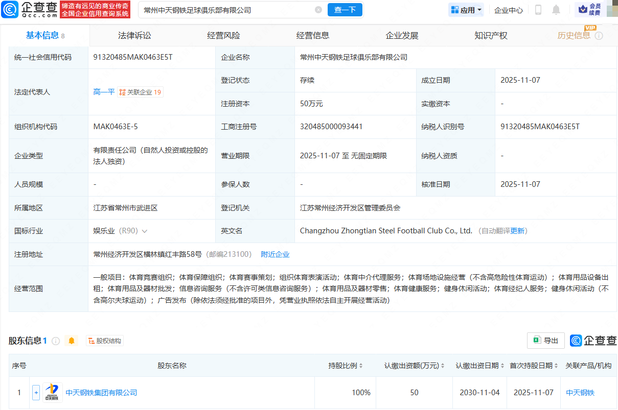 企查查APP显示,近日,常州中天钢铁足球俱乐部有限公司成立,法定代表人为高一平,经营范围包含:体育竞赛组织;体育保障组织;体育赛事策划;组织体育表演活动;体育中介代理服务等。企查查股权穿透显示,该公司由中天钢铁集团有限公司全资持股。